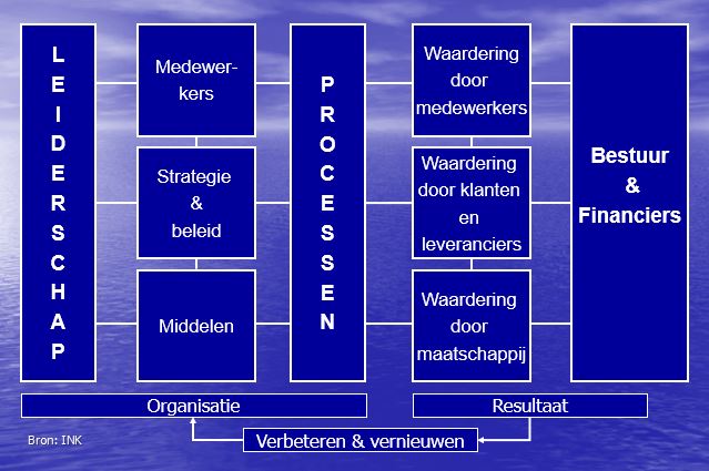 Het INK managementmodel helpt bij het houden van overzicht van de aandachtsgebieden en helpt veranderprocessen op een gestructureerde manier vorm te geven. Van Stakeholder tot Management, van rechts naar links.